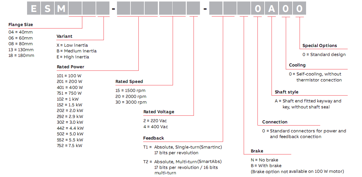 ESM系列伺服電機(jī)用于高動(dòng)態(tài)精度的運(yùn)動(dòng)控制由于其轉(zhuǎn)矩密度高,ESM系列伺服電機(jī)具有高動(dòng)態(tài)響應(yīng)。單圈和多圈高分辨率值編碼器反饋可選件可匹配應(yīng)用要求。ESM系列電機(jī)外殼符合IP65防護(hù)等級。額定功率從0.1kW至7.5kW,五個(gè)標(biāo)準(zhǔn)的框架法蘭尺寸為40,60,80,130和180毫米,可添加制動(dòng)可選件??蚣?0-80法蘭的電機(jī)提供引出線,方便電機(jī)動(dòng)力和反饋的連接。